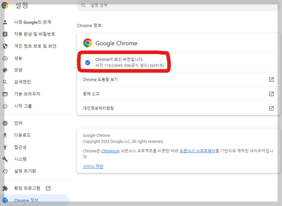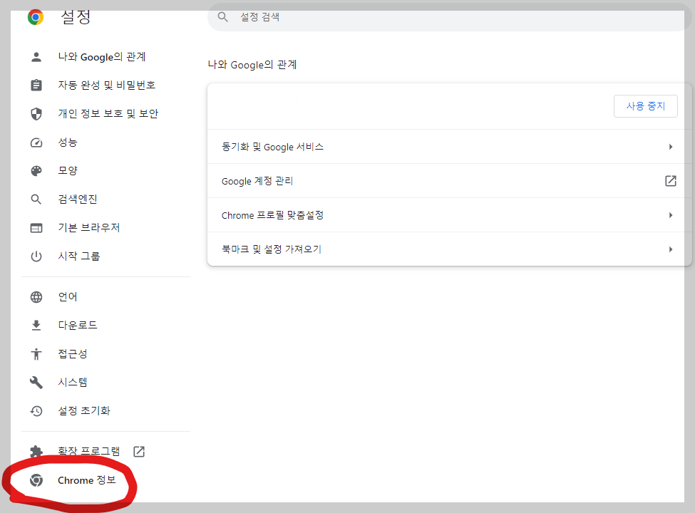 크롬 드라이버는 자신의 버전과 맞아야한다. 버전을 보려면 크롬에서 오른쪽 위 점 세개 부분을 누르고, 설정에 가서, 왼쪽 맨 아래에 있는 크롬 정보를 누르면 나온다.
