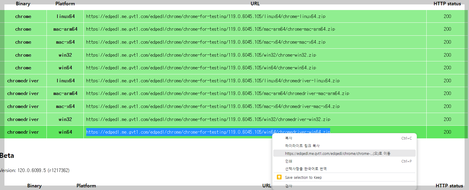 자신의 버전에 맞게 설치하면 되는데, 저는 윈도우64비트 환경이라 맨 아래 크롬드라이버를 다운받았습니다.
