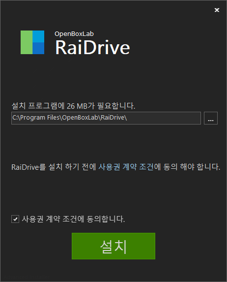 여기에서 '사용권 계약 조건에 동의합니다.' 를 체크하고 설치를 누르면 된다.