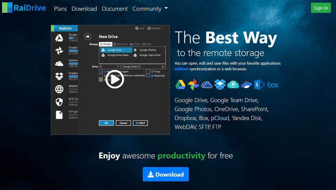 Download RaiDrive. Conveniently manage all your cloud services as a network drive using the standard file explorer via this straightforward application