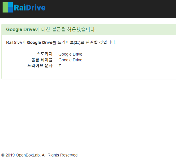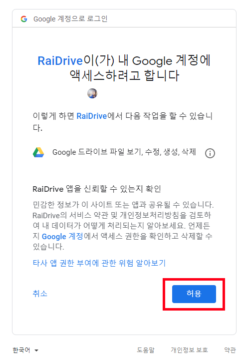 로그인하면 RaiDrive가 구글 계정에 액세스하려고 한다. 이 때 허용을 누르면